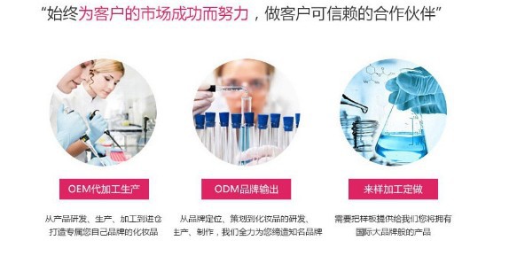 6、产品承诺:解密市场新潮产品,提供市场热点爆款产品;独特的配方研制,提供特殊卖点产品;可提供策划,设计、包材、配方、生产、送货一站式服务,真正优质低价;全过程跟踪服务,您只需把想法告诉我们,剩下的全部交给我们解决,我们将用最专业的一站式服务协助您轻松拥有化妆品牌,让您全程无忧。
